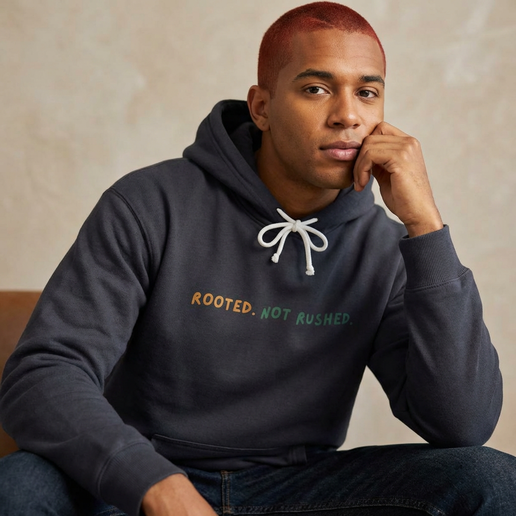 The Rooted. Not Rushed. Hoodie is designed for quiet mornings, cool evenings, and everyday moments where ease matters most. Garment-dyed for a soft, lived-in feel, it offers comfort from the very first wear.